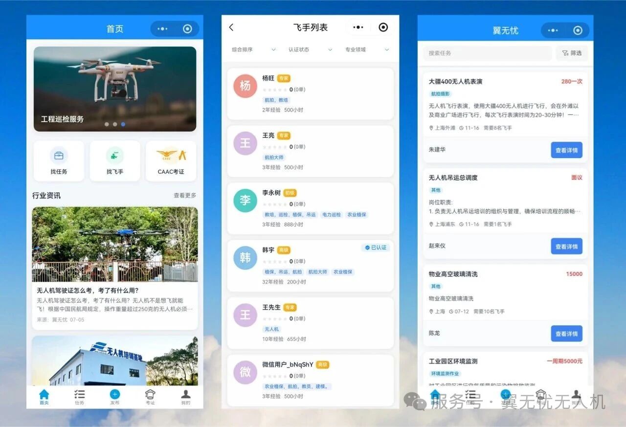 更关键的是,翼无忧自主研发了“飞手无忧”平台。这个平台无缝连接持证飞手与企业用工需求,根据你的技能画像精准匹配就业机会,真正构建了“培训+平台+就业”的完整生态闭环 。